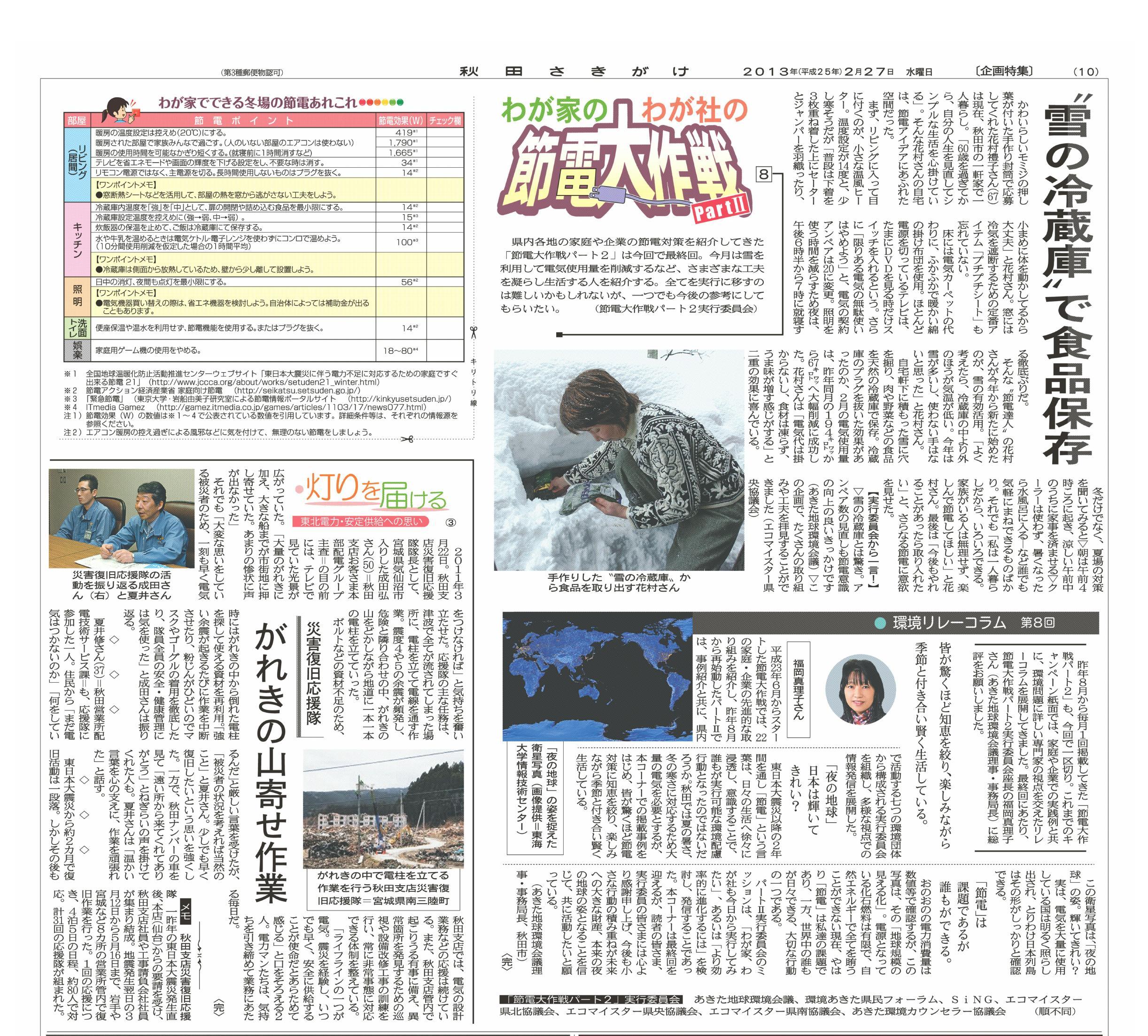 平成23年に引き続き、秋田魁新報にて昨年8月よりスタートした【節電大作戦PartⅡ】が最終回を迎えました。 今年度は、秋田県内で環境活動をしている7団体による実行委員会を組織し、多様な視点での節電大作戦を展開しました。リレーコラムも見どころのひとつでしたが、第1回目はCEEA 蒔田明史 代表理事 のコラムでスタート。最終の第8回目は、CEEA 福岡真理子 事務局長がアンカーを務めました。キャンペーン紙面は終了しますが、これからも「節電行動」を一緒に頑張りましょう!(^^)!。