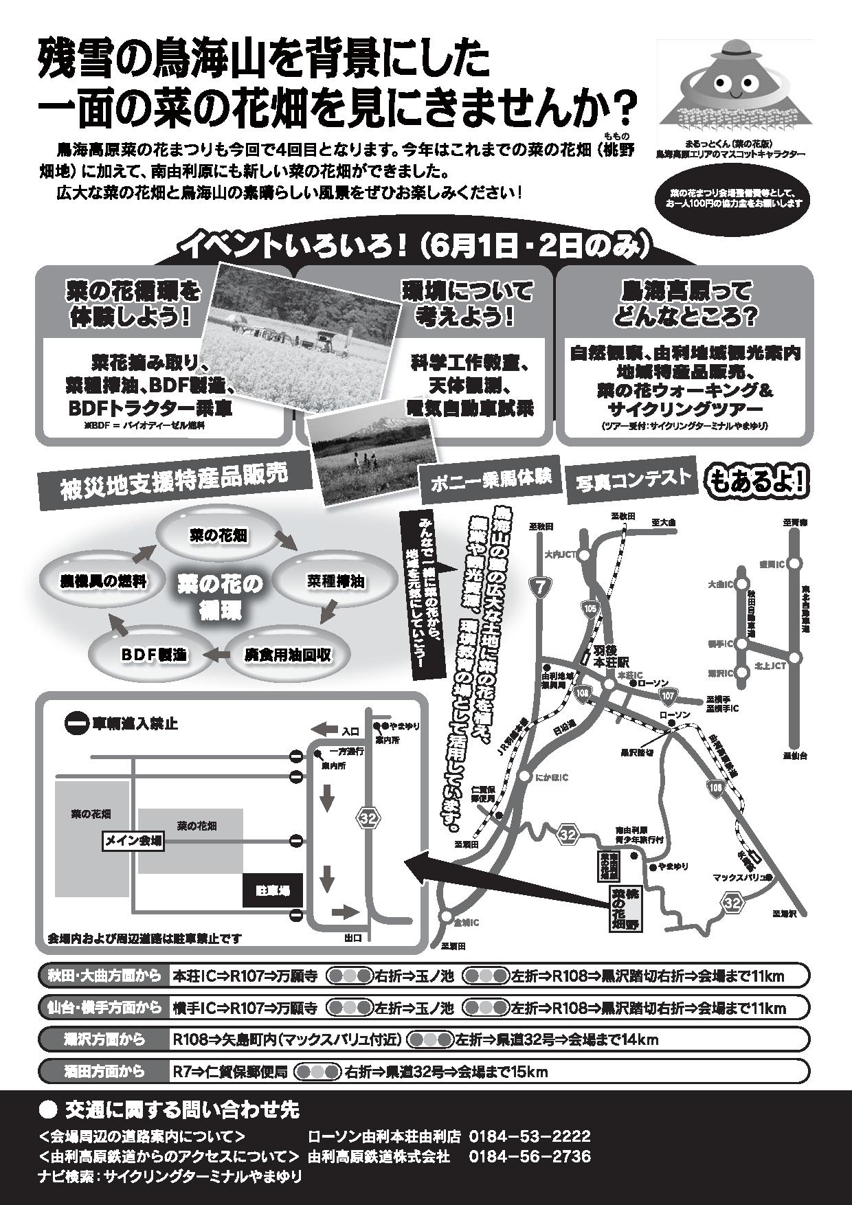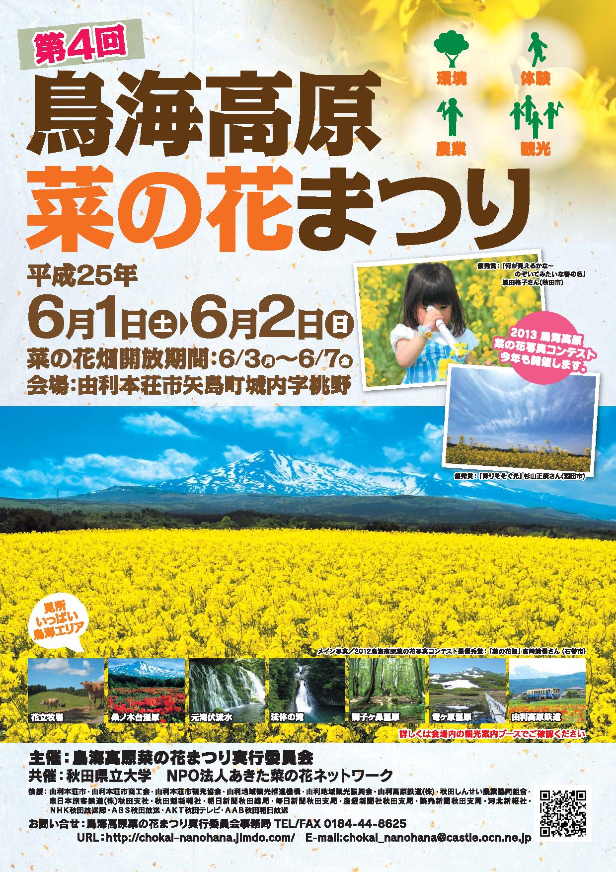 平成25年6月1日(土)⇒6月2日(日)に鳥海高原(由利本荘市矢島町桃野)で、第4回菜の花まつりが開催されます。「菜の花摘み取り」「BDFトラクターの乗車」「被災地支援特産品販売」等イベント盛り沢山です。是非、黄色一面の菜の花畑で楽しい1日をお過ごし下さい。