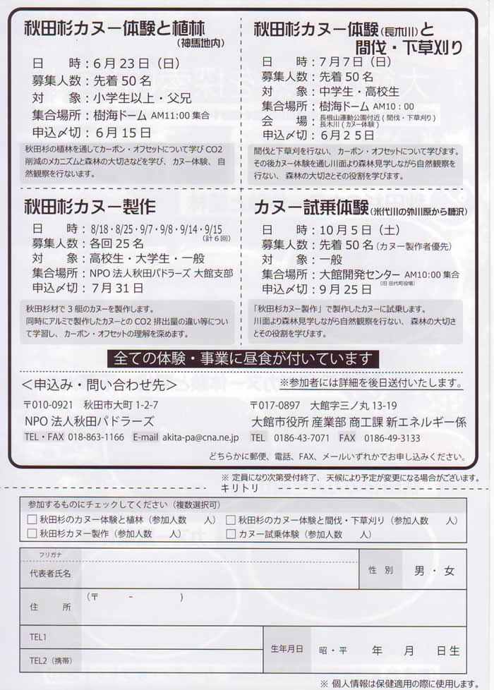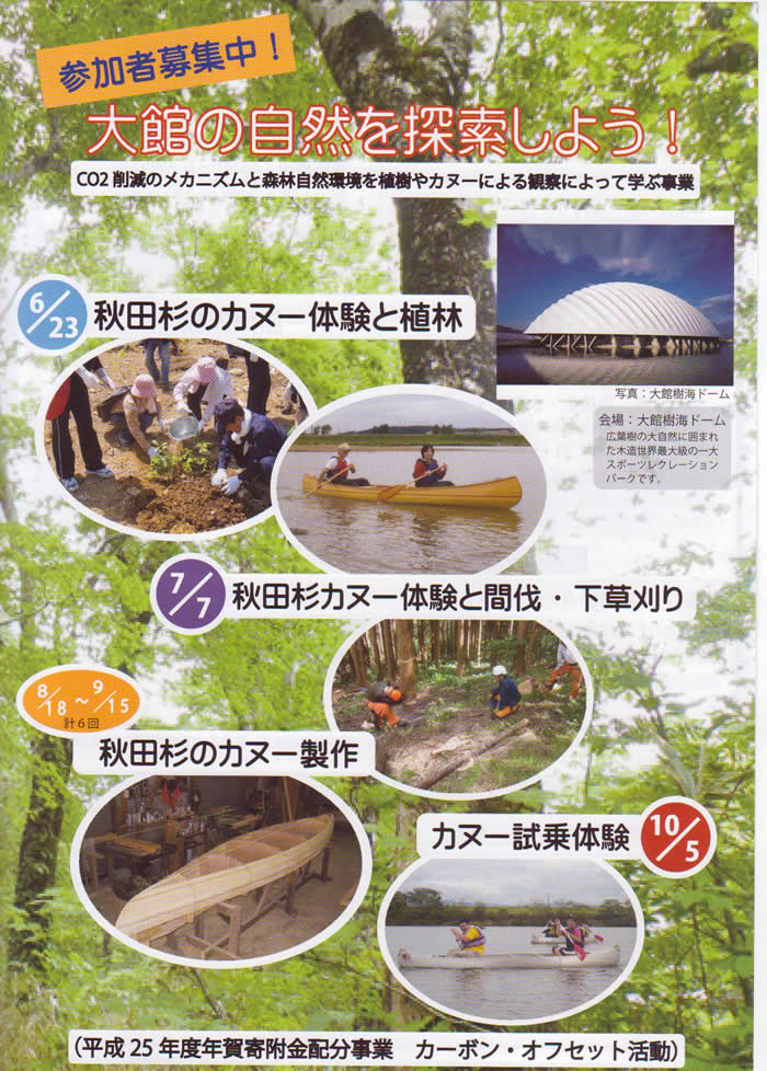 秋田杉の植林を通してカーボンオフセットについて学びCO2削減のメカニズムと森林の大切さなどを学び、カヌー体験、自然観察を行います。