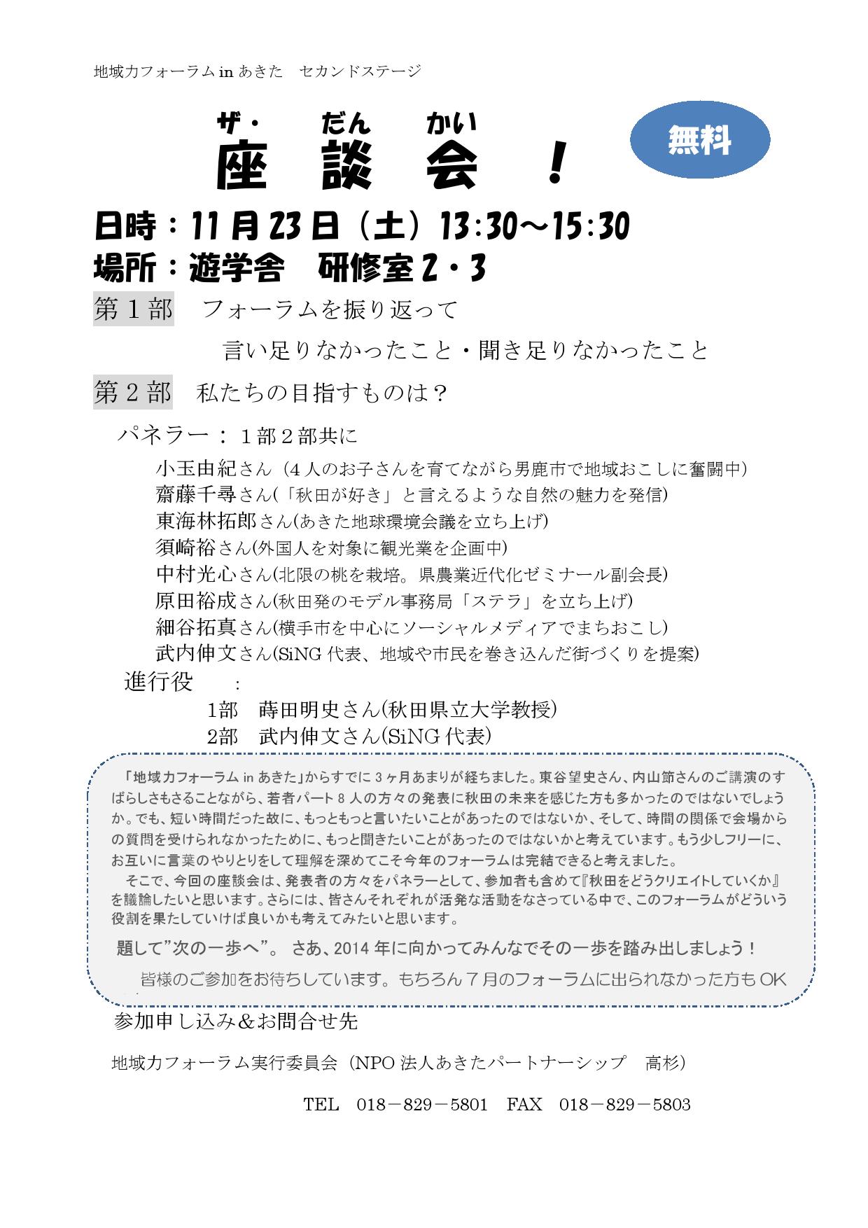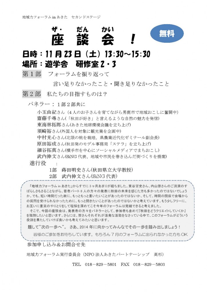 平成25年7月28日(日)に開催された「地域力フォーラム in あきた―We create our future -なまはげ・こまちを超えて―」の第2弾に当たる座談会が下記概要で開催されます(チラシも参照ください) 。