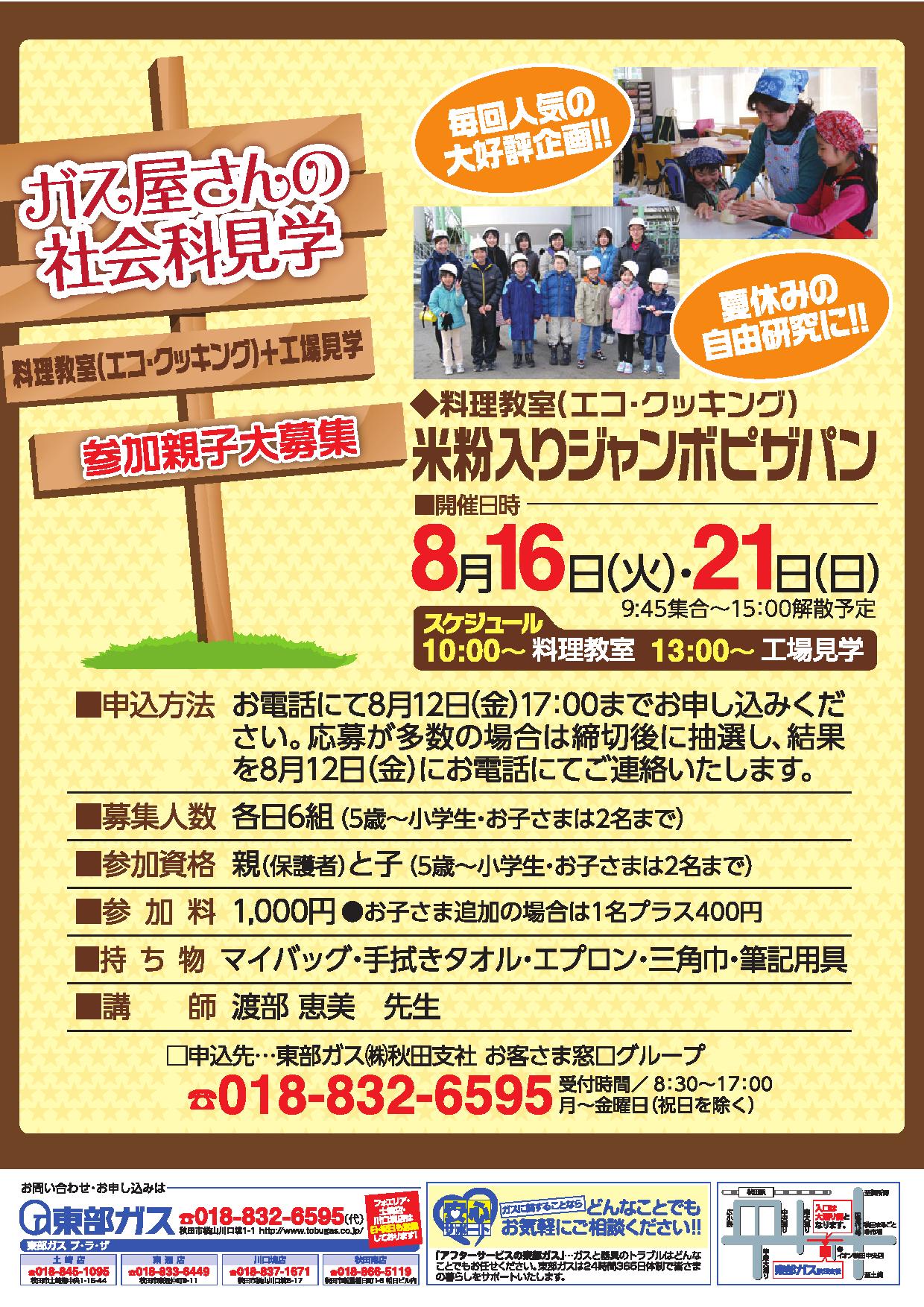 【8月16日・21日】ガス屋さんの社会科見学『料理教室(エコクッキング)+工場見学』が開催されます