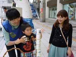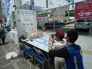 再生可能エネルギーの一つである”バイオマス”について、「たき火発電機」やパネル、積み木ゲーム等を通じて、楽しく遊びながら知識を深めるコーナーを設けました。このブースで用いられたツールやパネルは、秋田市地球温暖化防止活動推進員が作製されたもので、当日も推進員による啓発活動を行いました。