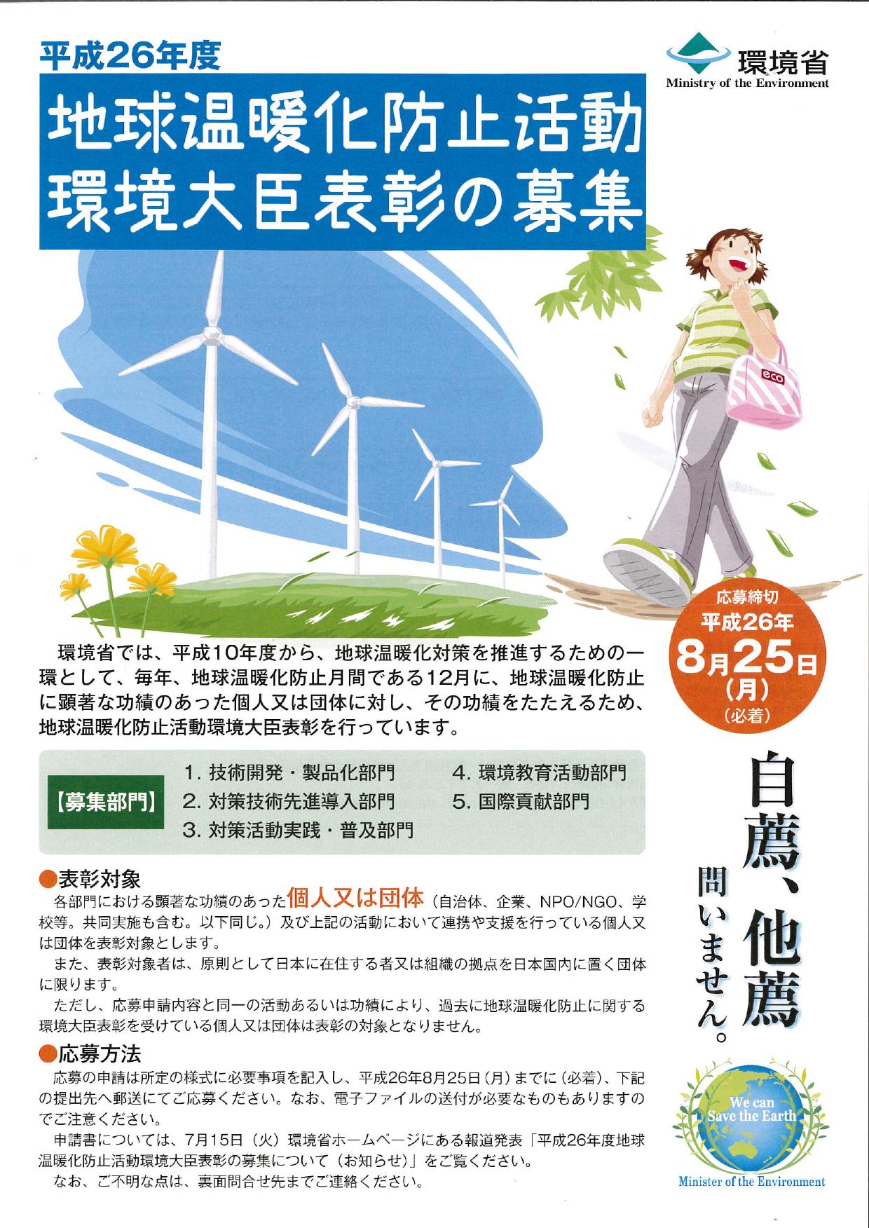 問い合わせ先 平成26年度地球温暖化防止活動環境大臣表彰事務局 (一般社団法人地球温暖化防止全国ネット) TEL:03-6273-7785