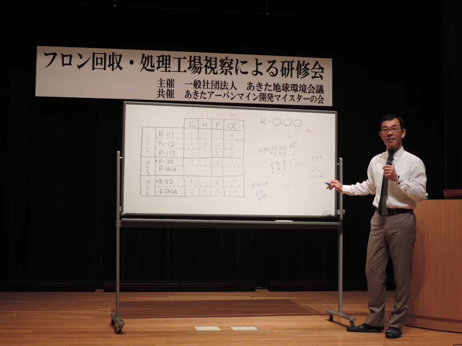 続いて「フロン関連事業の今後」と題して、阿部化学株式会社(静岡県焼津市)代表取締役社長 阿部裕之さんからご講演いただきました。阿部化学株式会社は全国で五カ所しかない再生事業所の一つとして、フロン類全般の再生、破壊、資源化等の適正処理を実施されており、その取組についてお話しいただきました。また事業主として経営の観点や、フロン類の組成について参加型のレクチャーもありました。