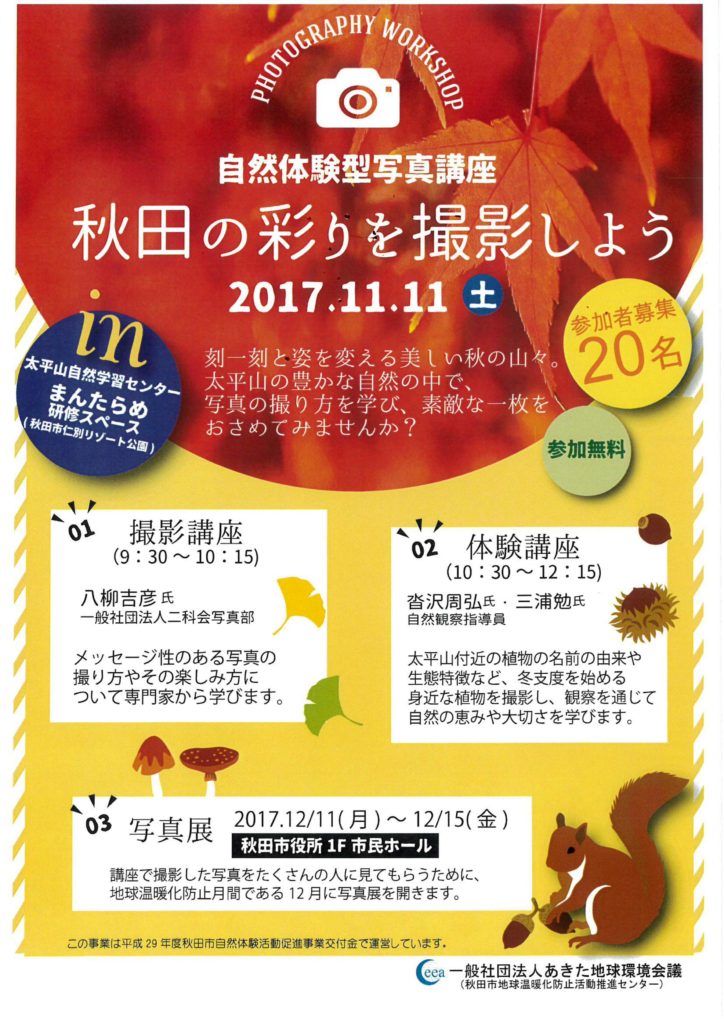 あきた地球環境会議では、秋田市自然体験活動促進事業交付金を受けて自然体験写真講座を開催します。