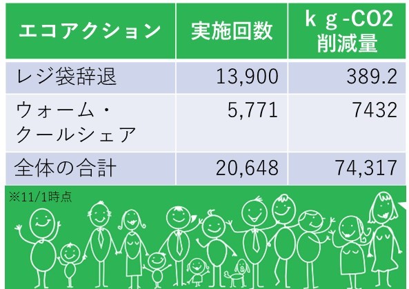 ユーザーの皆さんに実施頂いています、レジ袋辞退やクールシェア・ウォームシェアなどのアクション回数が、