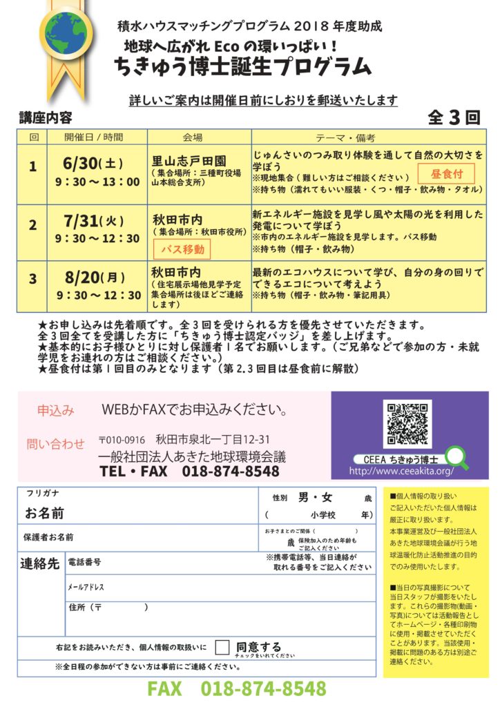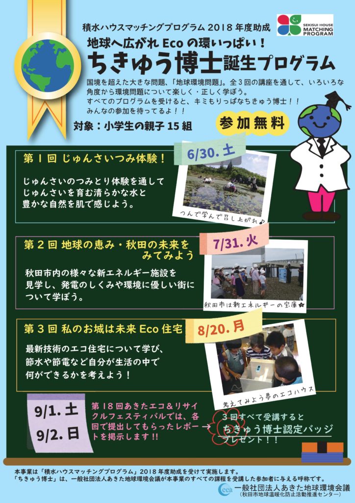 CEEAでは、積水ハウスマッチングプログラム2018の助成を受けて、親子を対象とした以下の環境体験イベントを開催いたします。 環境保護や地球温暖化に関する体験活動を通じて、身近なところから環境について考えるきかっけを持つことを目的としています。