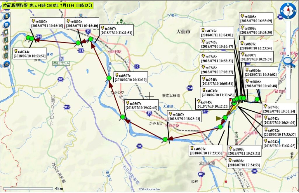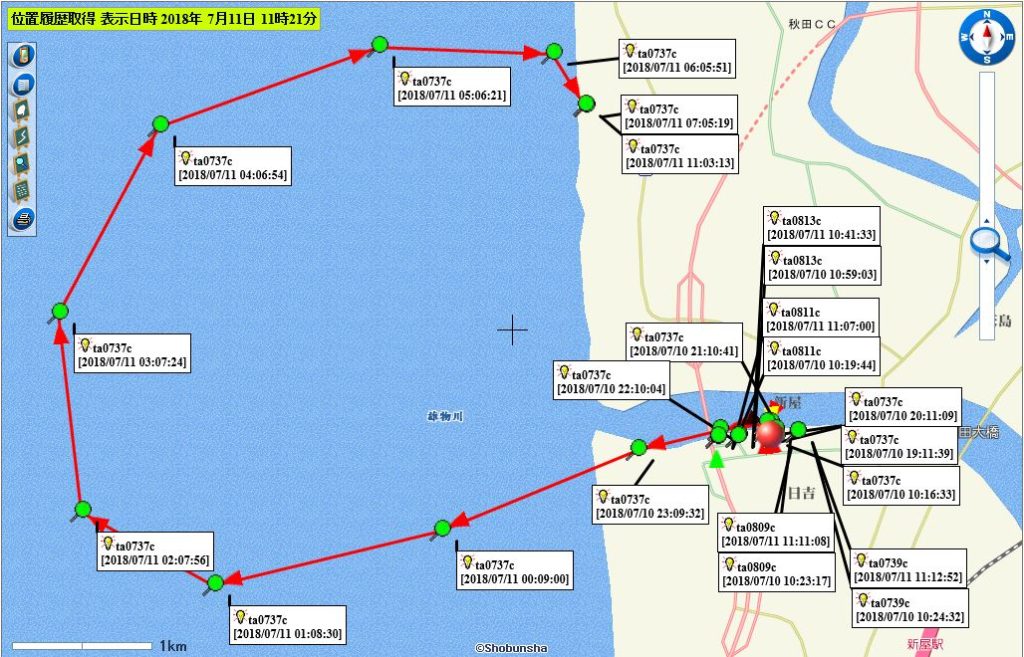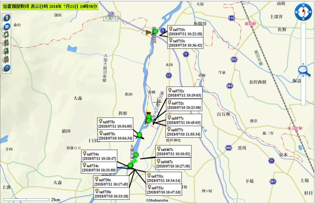 下流域(日本海を漂流中の0736c、0738c、0812cは圏外になり最新情報はない)(0737cは再放流を行い現在海岸に漂着していると推察される。0739c、0809c、0811c、0813cは河口付近で停滞中と推察される)