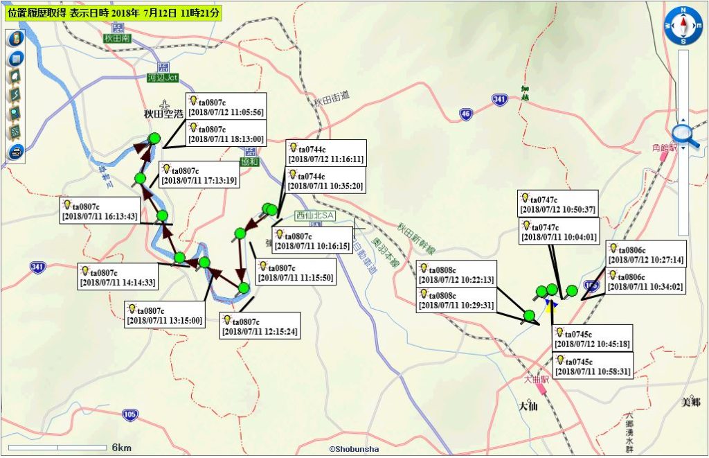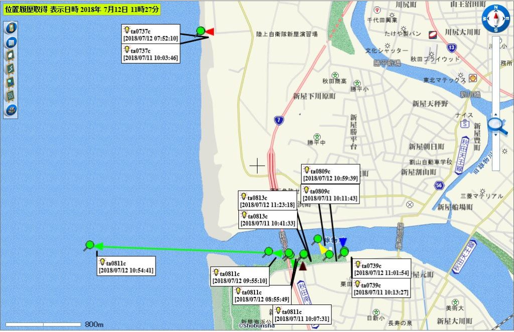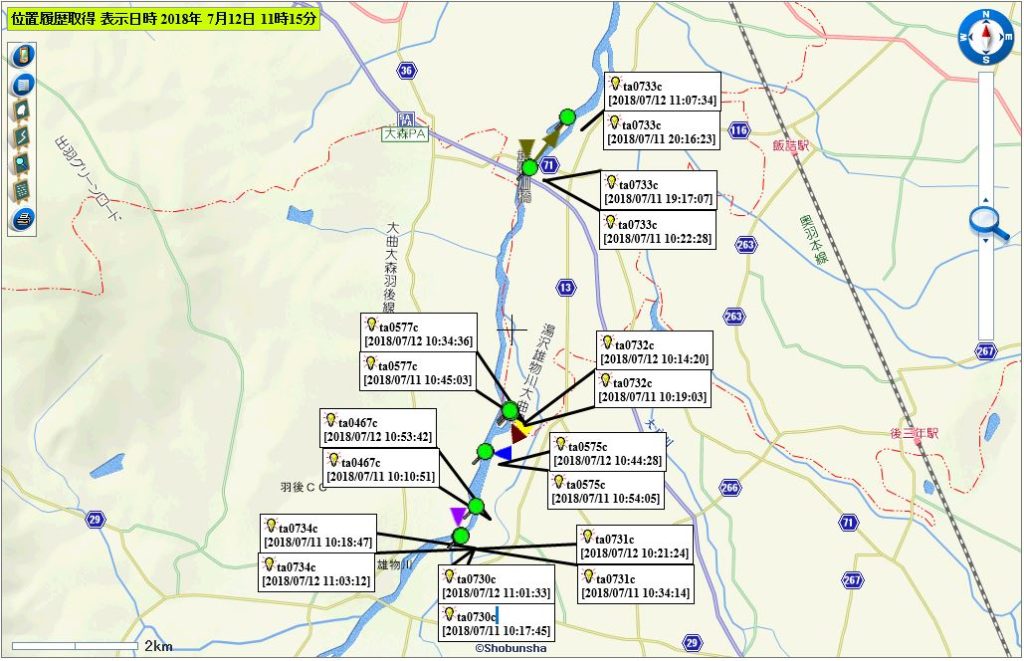 下流域(日本海を漂流中の0736c、0738c、0812cは圏外になり最新情報はない)(0737cは再放流を行い現在海岸に漂着したため回収した。0811cは再放流を行った。0739c、0809c、0813cは河口付近で停滞中と推察される)