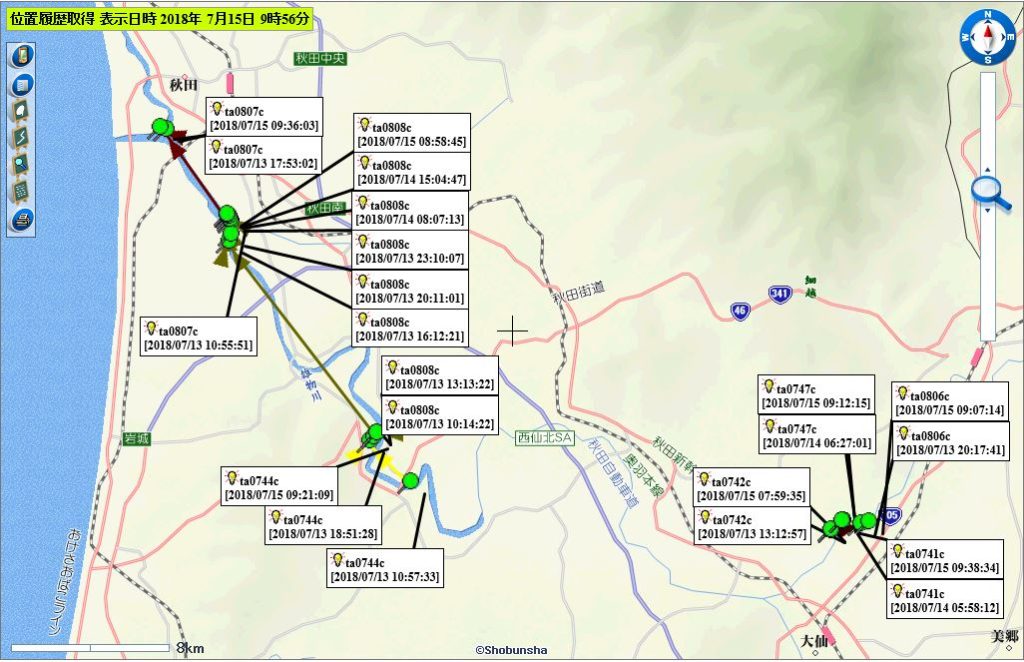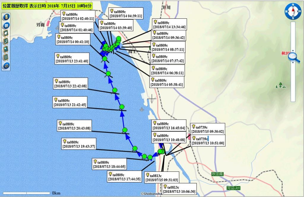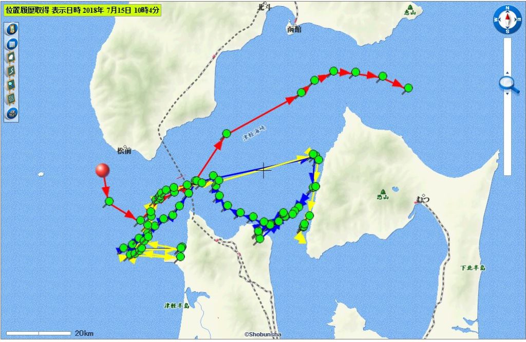 下流域(日本海を漂流中の0736c(赤)、0738c(青)、0812c(黄)が青森県および北海道沖で再度圏内になり、位置情報が更新された。)