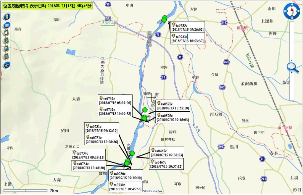 (0811cは漂着した可能性があるが、現在発信がない。0809cは漂着の可能性がある。0739c、0813cは河口付近で停滞中と推察される)