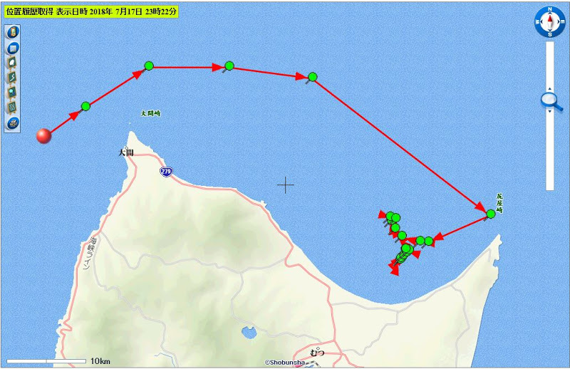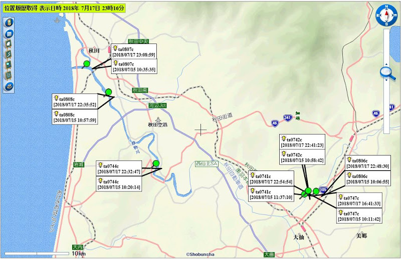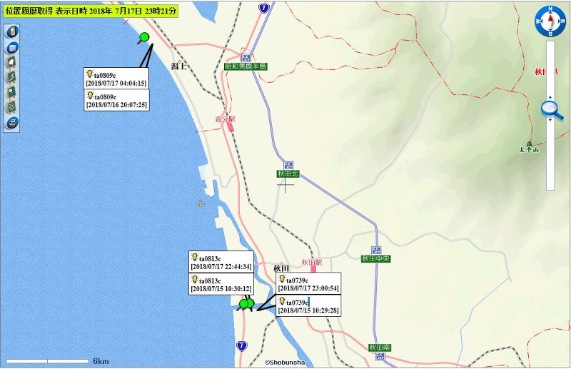 下流域(日本海を漂流中の0736c、0812cは圏外または発信無しとなった。0738cは青森県沖での位置情報が更新された。)
