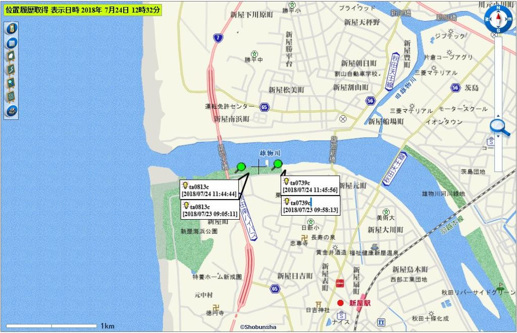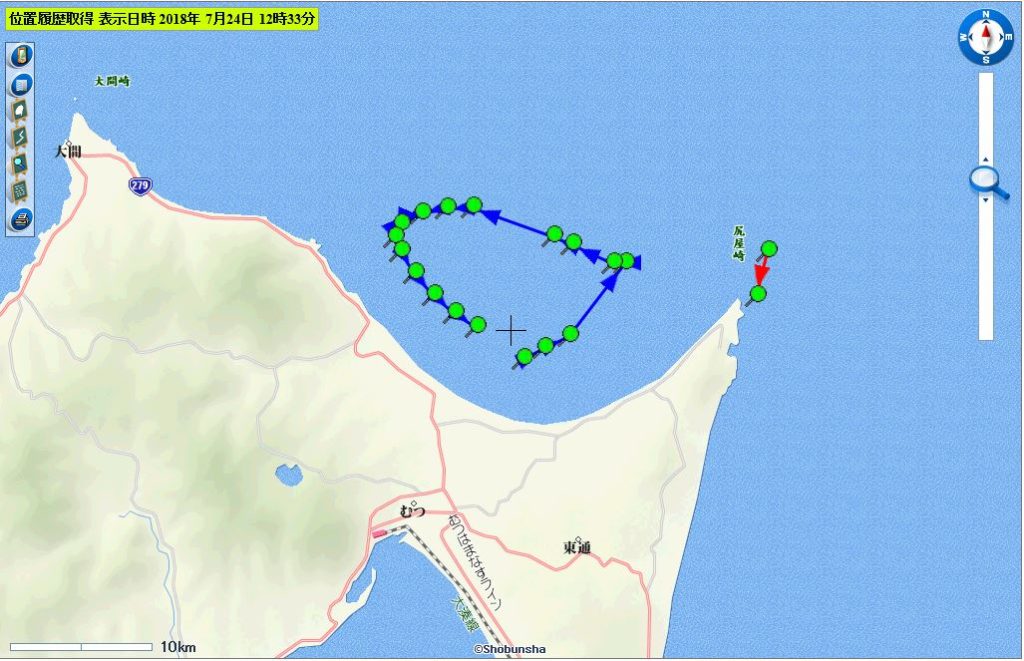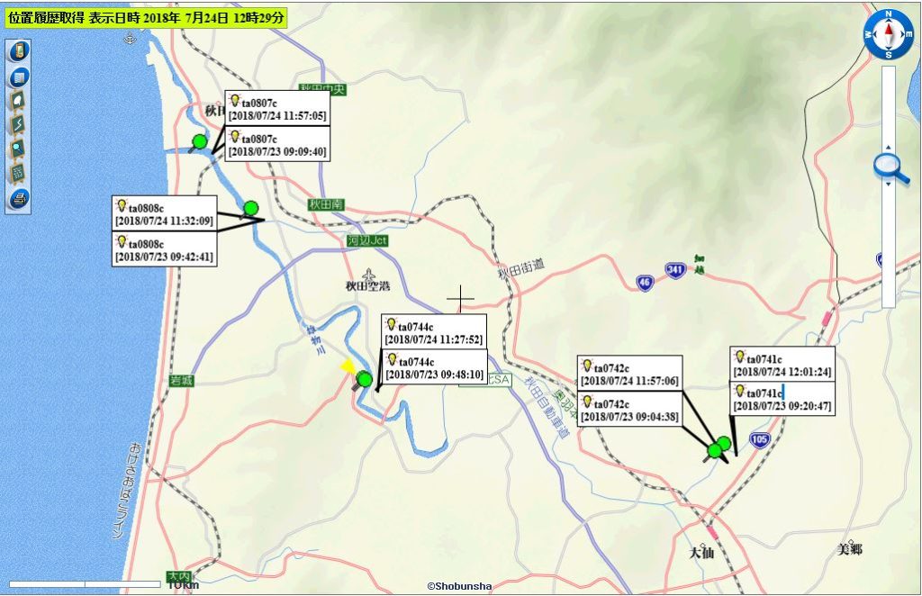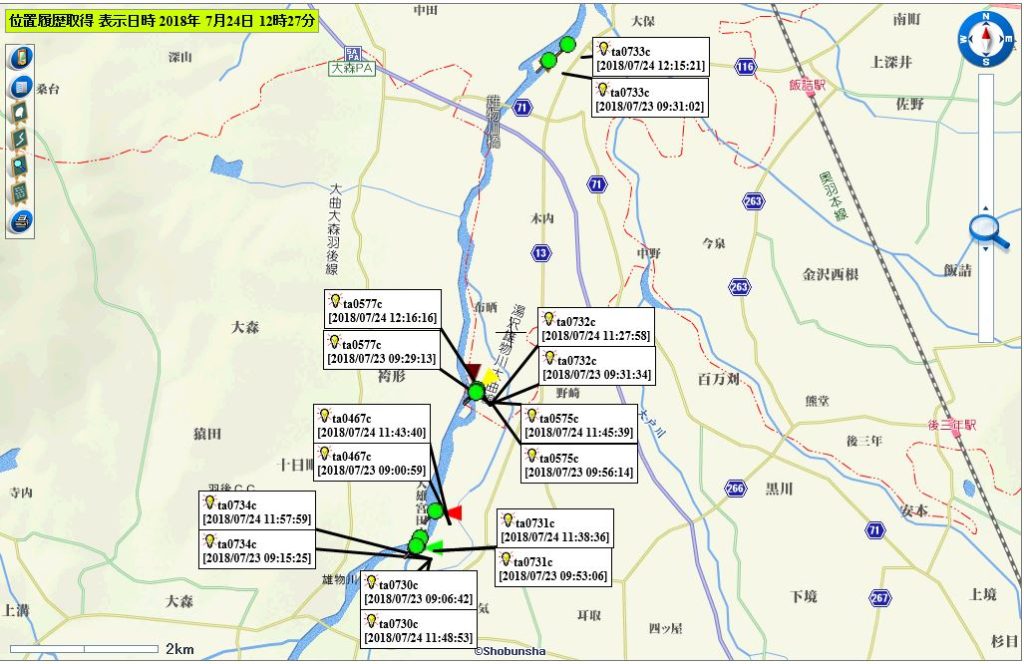 下流域(日本海を漂流中の0812cは圏外または発信無し。0736c(赤)、0738c(青)は青森県沖での位置情報が更新された。)