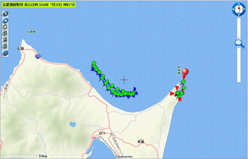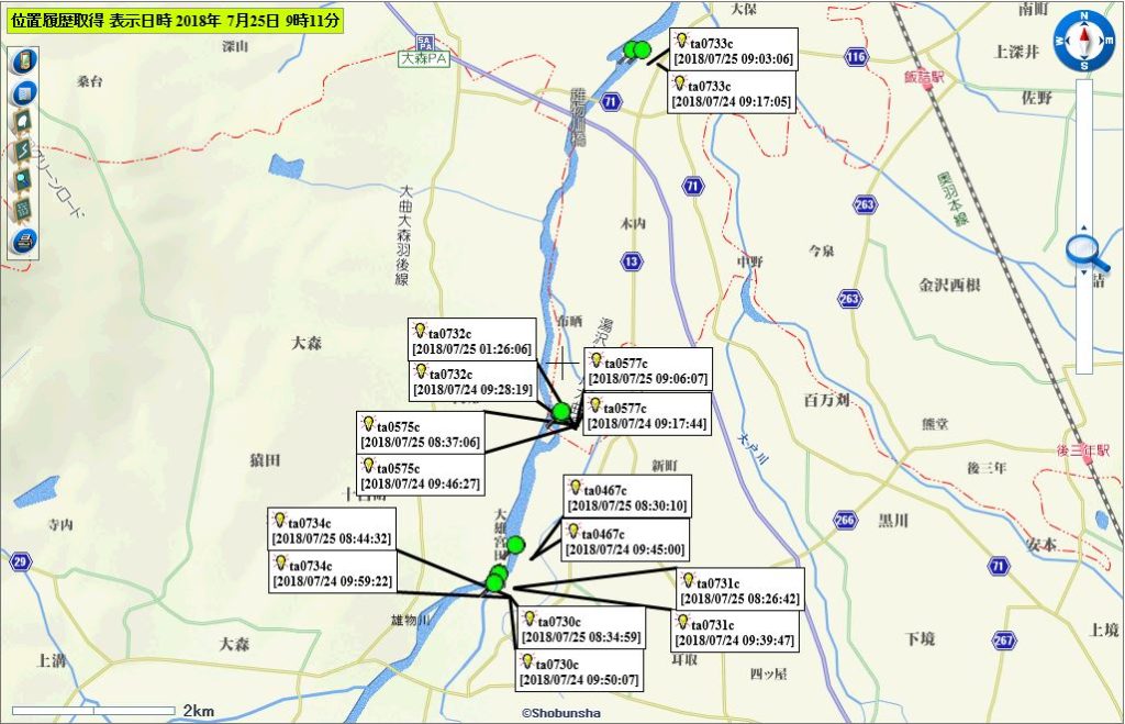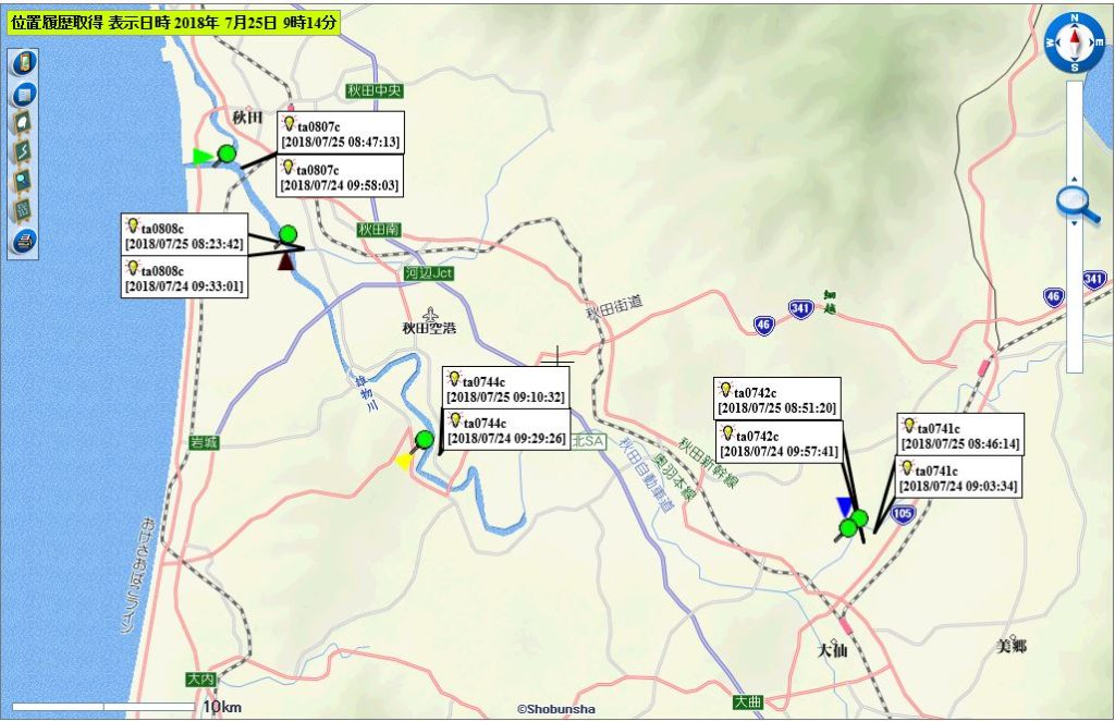 下流域(日本海を漂流中の0812cは圏外または発信無し。0736c(赤)、0738c(青)は青森県沖での位置情報が更新され、0736c(赤)が漂着した可能性がある。)