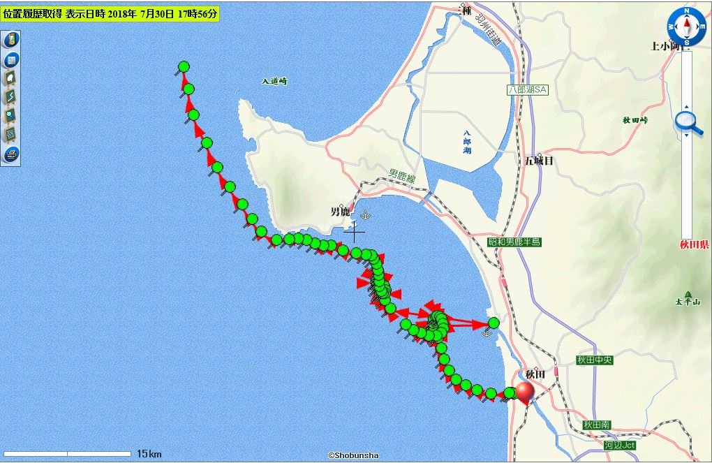 下流域(日本海を漂流中の0812cは圏外または発信無し。0738c(青)は青森県沖での位置情報が更新され、0738c(青)も0736c(赤)と同様、漂着した可能性がある。)