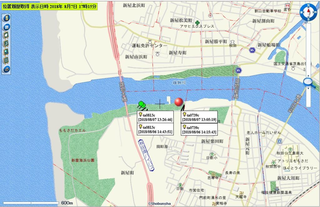 中流域(0741c、0742c、0745c、0806cは発信がない。0807cは岩舘に漂着したと考えられるが、8月5日に一度発信が再度あったが現在は発信はない。0744c、0808cは下流域で停滞中。0747cは回収済み。)