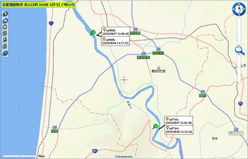 下流域(0811c、0812cは圏外(海上)または発信無し。0738c、0736cは漂着していたため回収した。0739c、0813cは河口付近で停滞中と推察される。0737c、0809cは回収済み。)