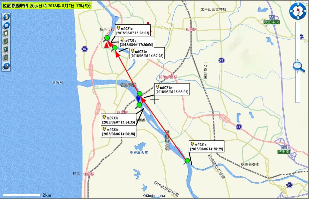 上流域(0577c、0732c、0467cは発信がない。0731c、0733cは下流域でそれぞれ再度停滞した。0575c、0730c、0734cは回収済み。)