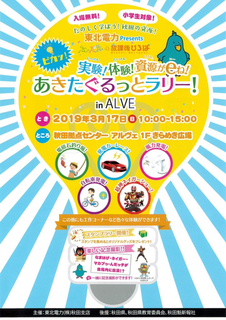 と き:2019年3月17日(日)10:00~15:00 ところ:秋田拠点センター アルヴェ 1F きらめき広場 入場無料! 小学生対象!