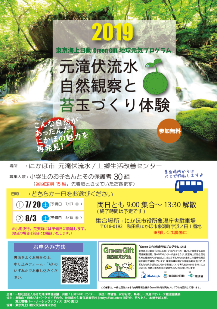 あきた地球環境会議では、平成29年度より東京海上日動火災保険株式会社が取り組む環境保護活動「Green Gift地球元気プロジェクト」の秋田県実施団体として、親子を対象とした環境体験イベントの企画運営を担当しています。