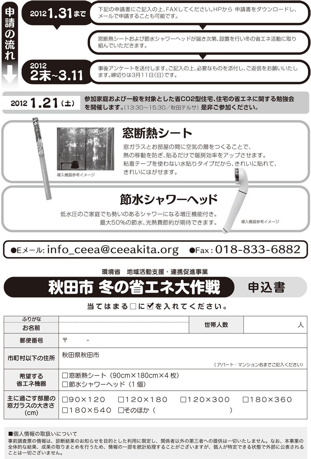 ●構成団体:一般社団法人 あきた地球環境会議(秋田市地球温暖化防止活動推進センター)、秋田市環境部、秋田県省エネルギー普及指導員センター、特定非営利活動法人 あきたパートナーシップ