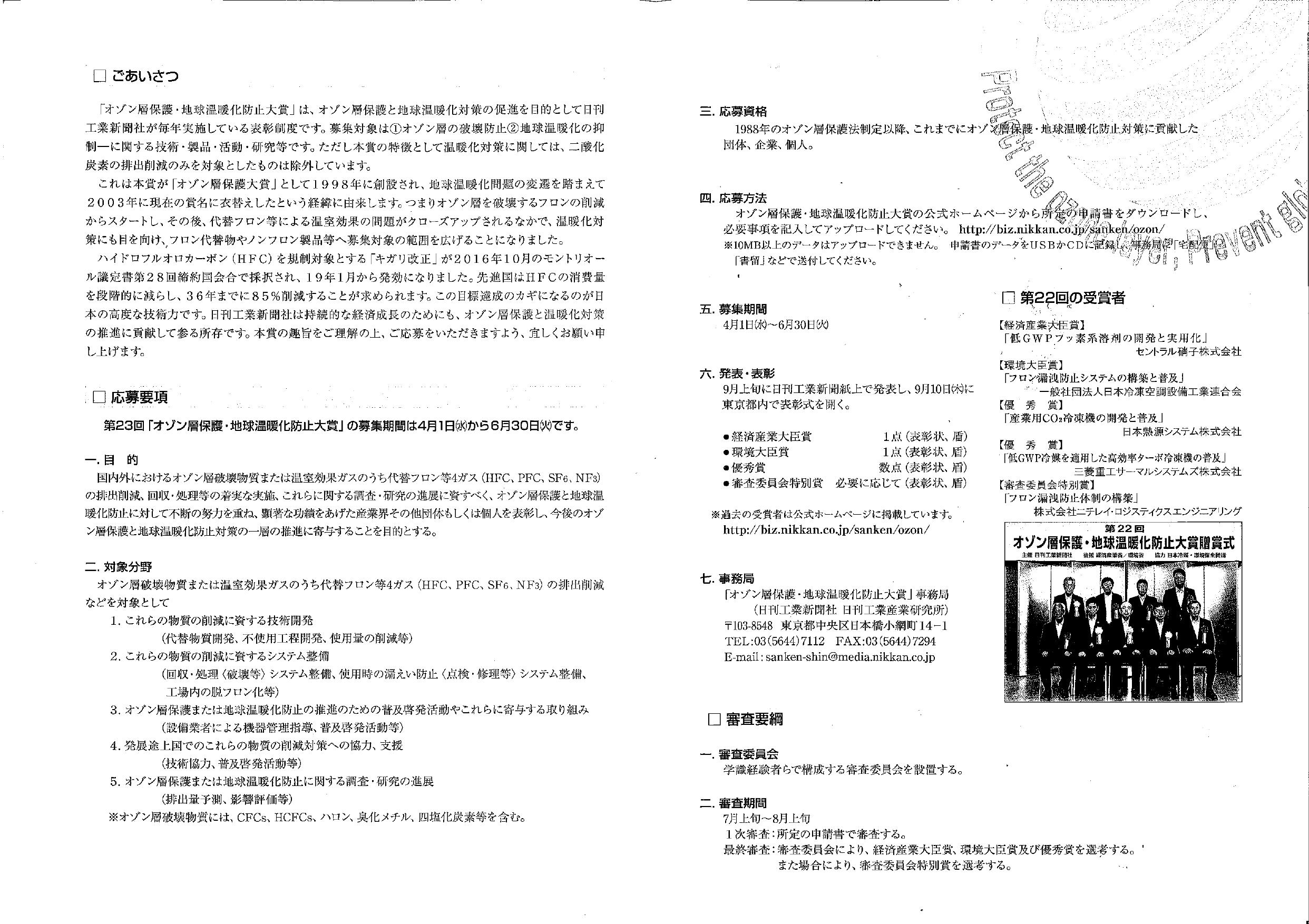 「オゾン層保護・地球温暖化防止大賞」はオゾン層保護と地球温暖化対策の促進を目的として日刊工業新聞社が毎年実施している表彰制度です。募集対象は⓵オゾン層の破壊防止⓶地球温暖化の抑制に関する技術・製品・活動・研究等(二酸化炭素の排出削減のみを対象としたものは除外)です。