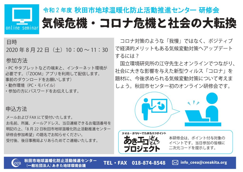 お名前、所属、メールアドレス、当日連絡できるお電話番号を明記の上、「8月22日秋田市地球温暖化防止活動推進センター研修会」