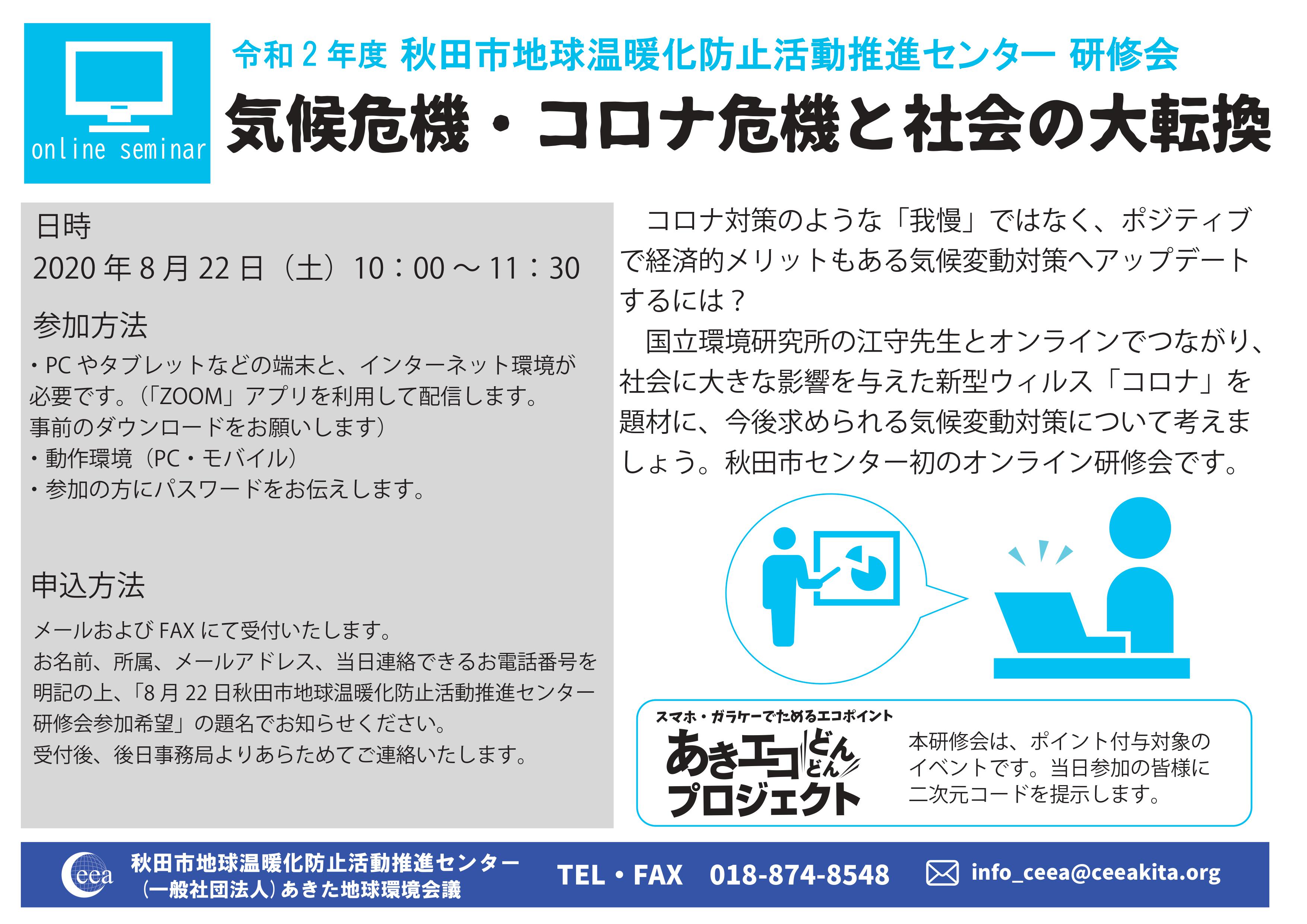 お名前、所属、メールアドレス、当日連絡できるお電話番号を明記の上、「8月22日秋田市地球温暖化防止活動推進センター研修会」