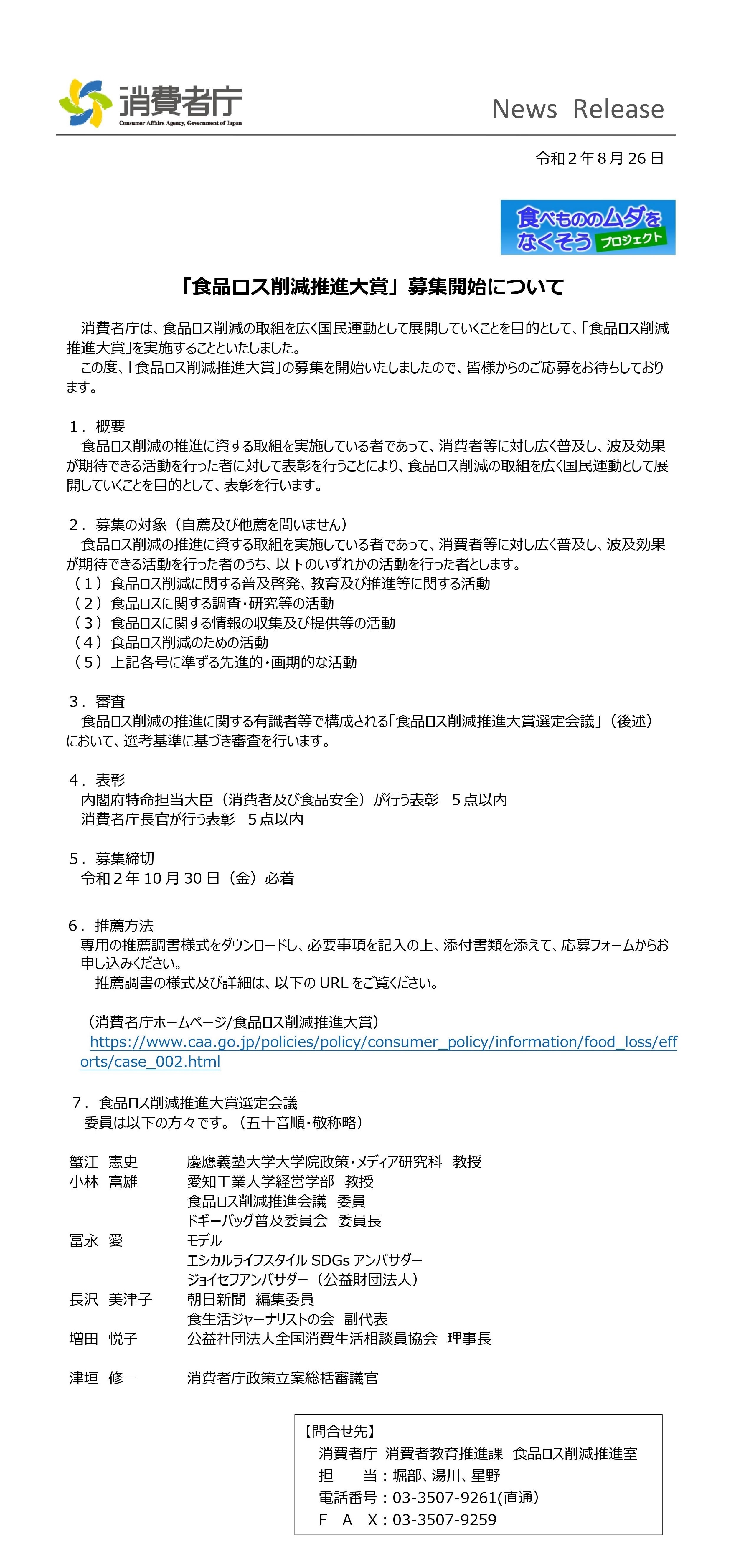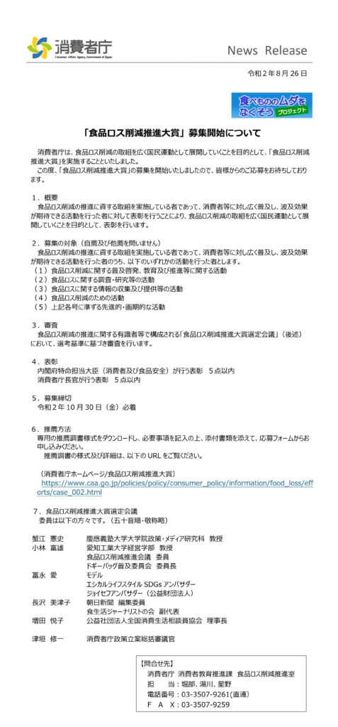 消費者庁では、食品ロス削減推進法及び基本方針に基づき、今年度新たに「食品ロス削減推進大賞」という表彰制度を創設し、募集を開始しました。