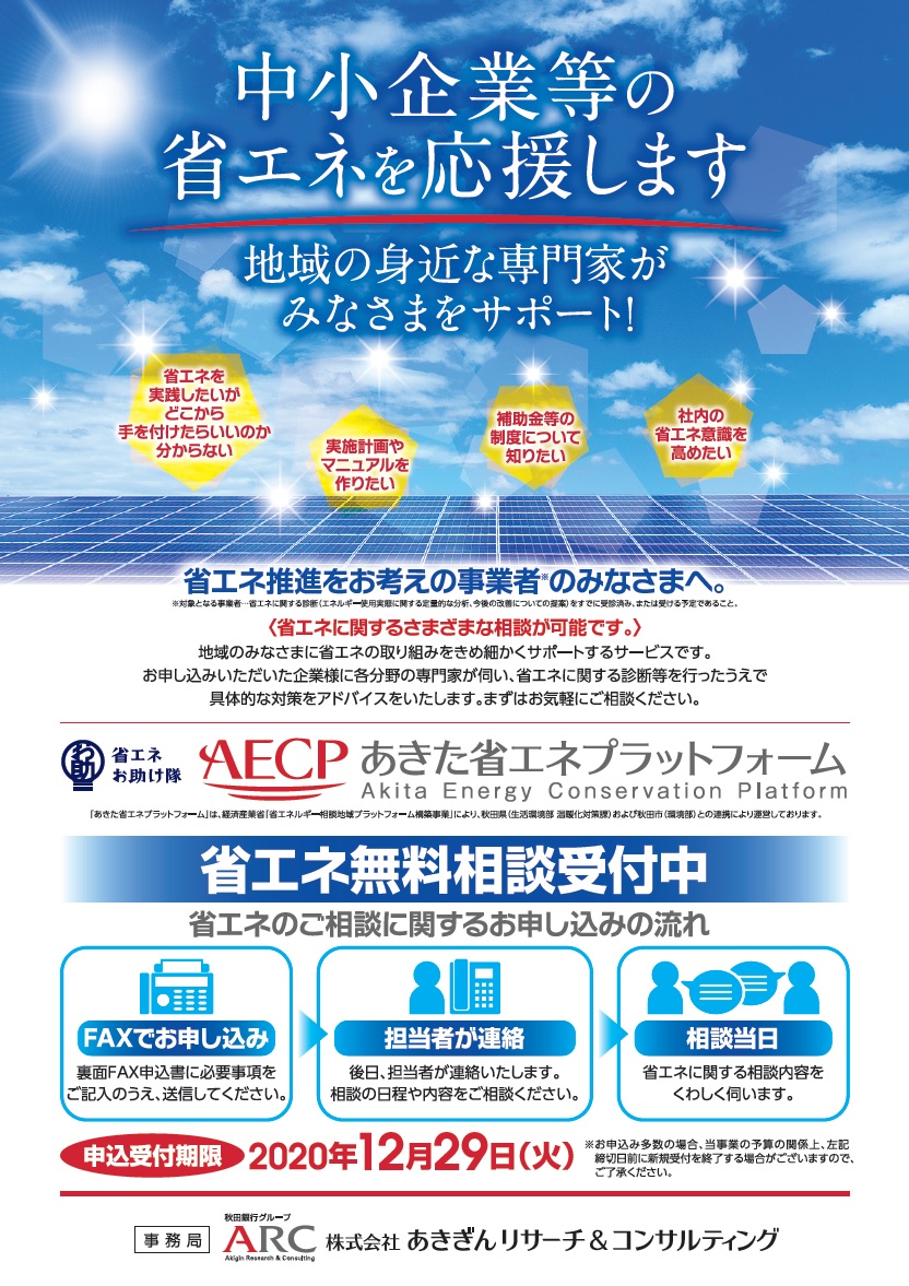 あきた省エネプラットフォームでは、秋田県内の中小企業等を対象に、省エネと経営それぞれの専門家が省エネ取組の段階に応じ、無料でサポートを行います(無料でのサポートには要件がございます)。