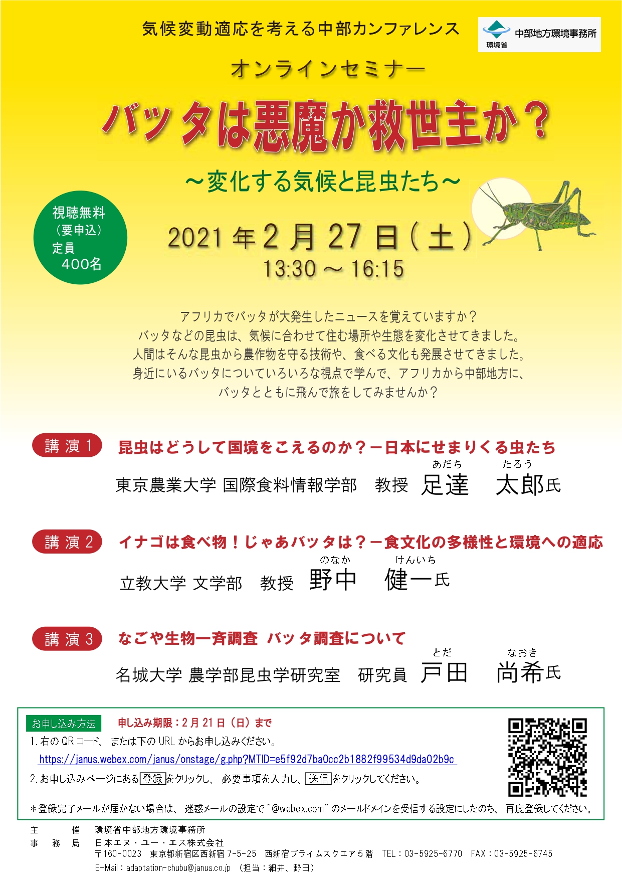 中部地方環境事務所から、オンライン開催イベントのお知らせです。アフリカでのバッタの大発生と気候の関係から、昆虫食という食文化、やバッタ調査の結果まで、盛りだくさんの内容です。