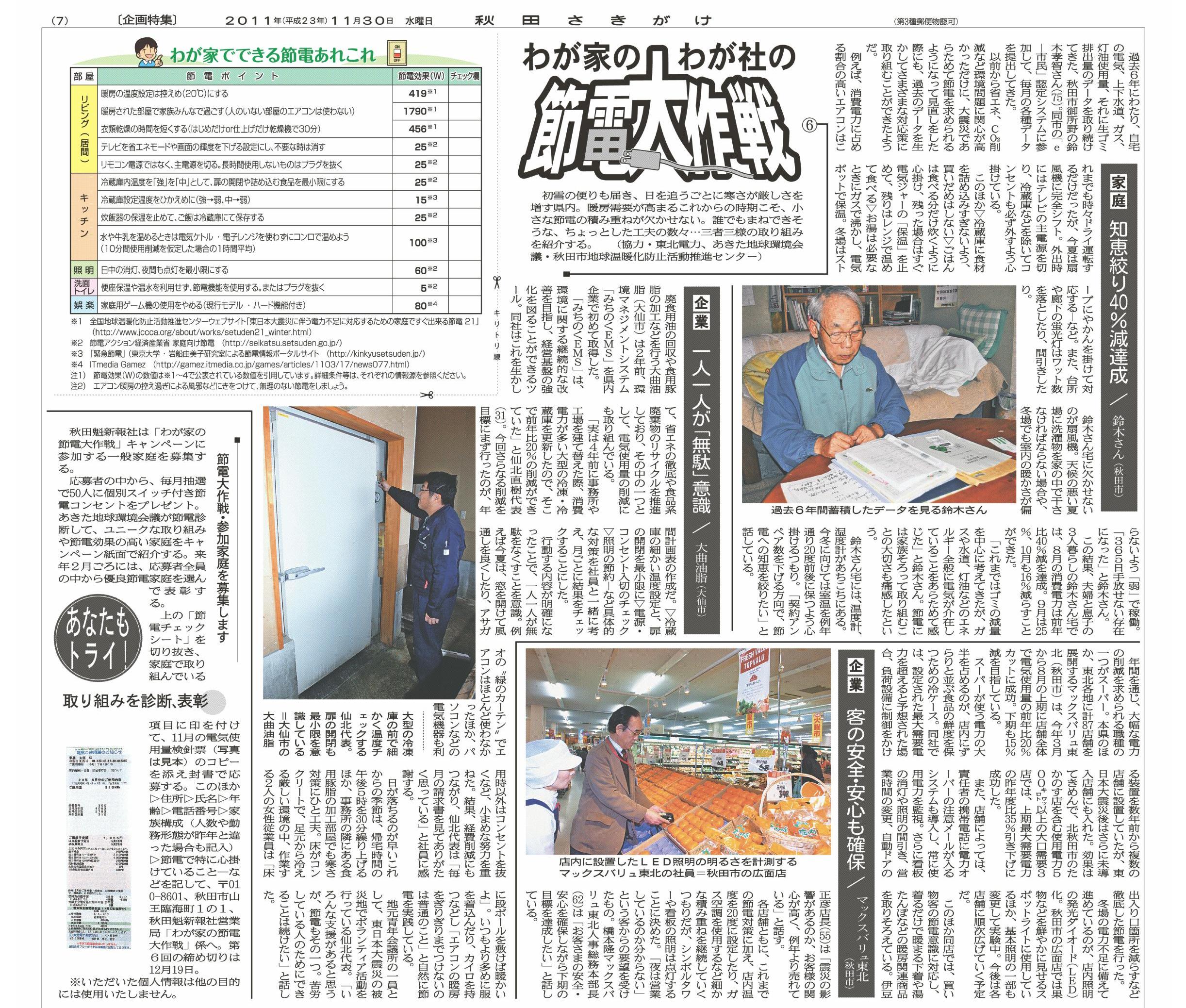11月30日(木) 秋田魁新報社にCEEA協力記事「節電大作戦」が掲載されました Vol.6