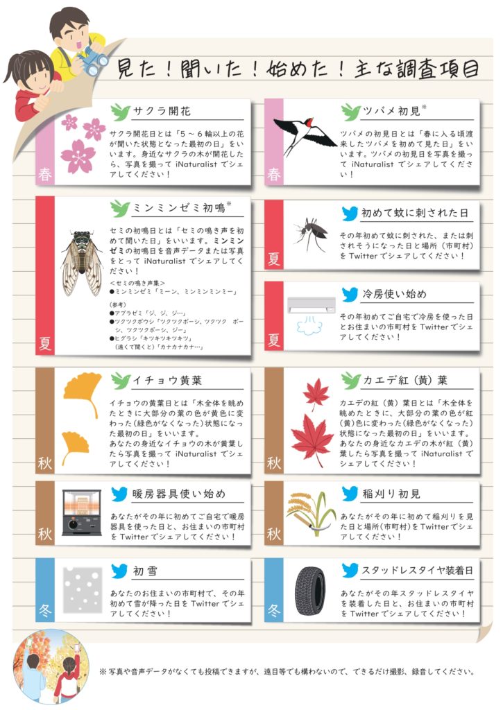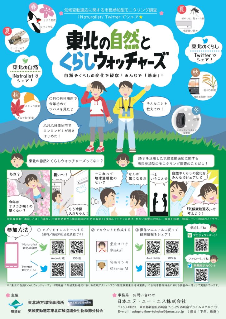 環境省東北地方環境事務所では、「気候変動適応における広域アクションプラン策定事業東北地域業務」の生物季節分科会における調査の一環として、身近な自然や生活季節の変化を知ることを目的として、市民参加による自然とくらしの調査「東北の自然とくらしウォッチャーズ」を実施します。