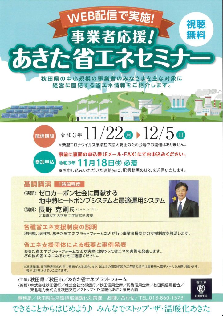 11/22~12/5までWEB配信で秋田県の中小規模の事業者のみなさまを主な対象に経営に直結する省エネ情報をご紹介します。 視聴無料ですので、どうぞご覧ください。