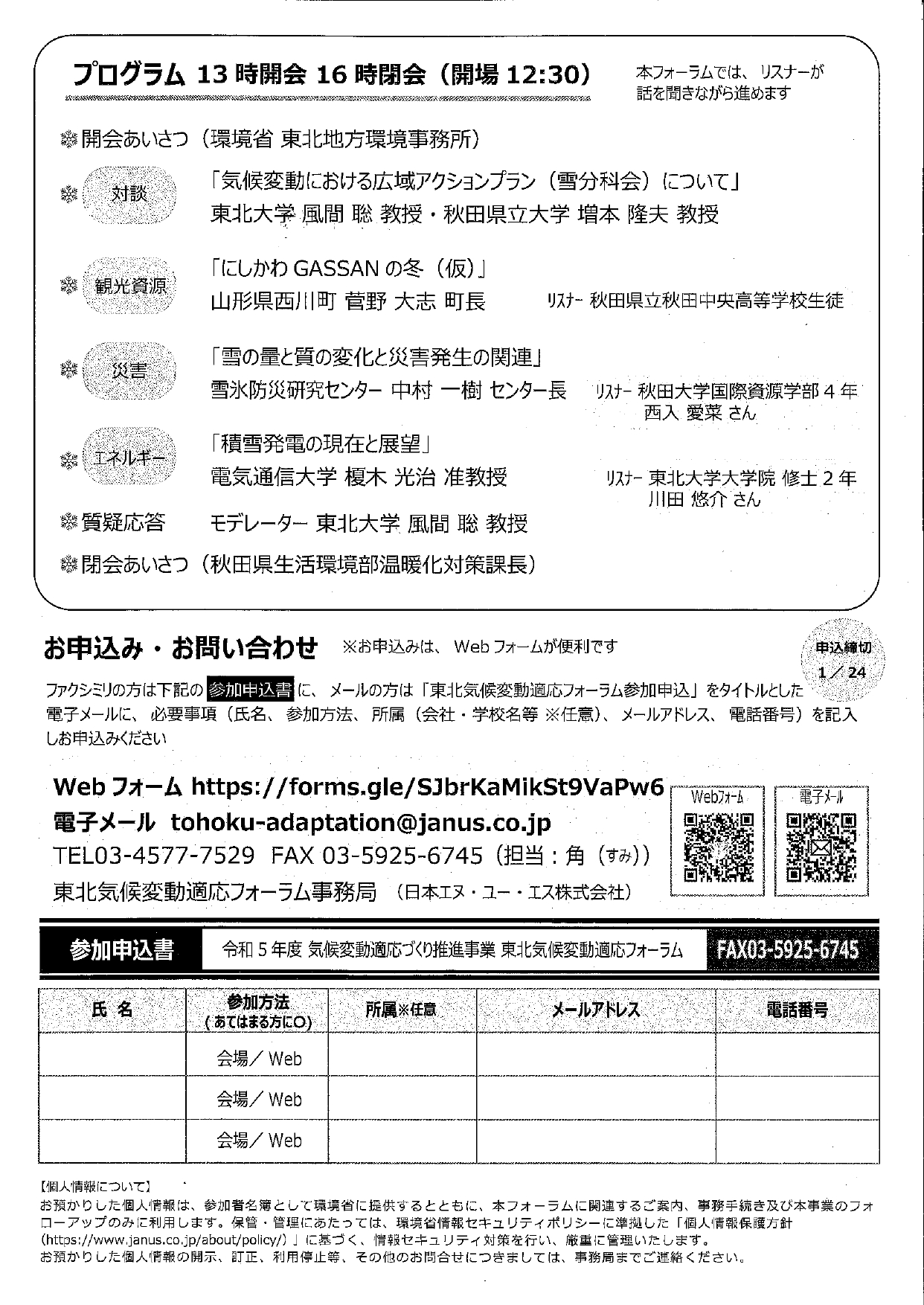 FAX、メールの⽅は「東北気候変動適応フォーラム参加申込」をタイトルとし、必要事項(⽒名、参加⽅法(会場⼜はWEB)、所属(会社・学校名等 ※任意)、メールアドレス、電話番号)を記⼊しお申込みください。