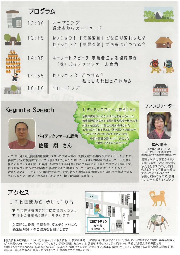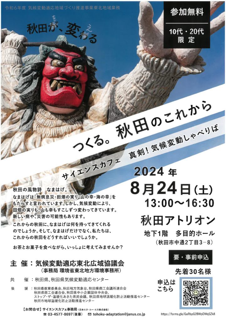 気候変動適応東北広域協議会(事務局:環境省東北地方環境事務所)では、10代、20代のみなさんを対象とした「サイエンスカフェin秋田 真剣!気候変動しゃべりば」を秋田市で開催いたします。