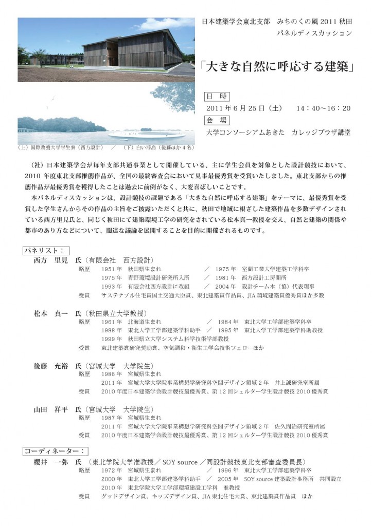 主旨: 近年の地球環境問題、自然災害を鑑み、我々は、もう一度自然を感じ、かつてのように自然を受けとめ、自然に呼応する建築のあり方を再考することが必要と考えられる。秋田の地域環境に対するそのような取組みを紹介を頂くと共に、昨年度の設計競技受賞学生に提案をプレゼンしてもらい、ディスカッションを開催する。PDテーマ「大きな自然に呼応する建築」14:40~16:20