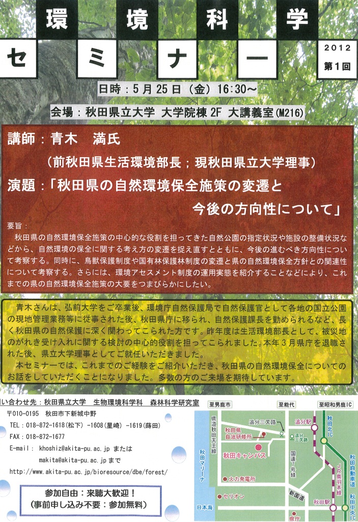 秋田県立大学(秋田キャンパス)にて,下記の要領で環境科学セミナーが開催されます.秋田県の自然環境保全施策に興味のある方は奮ってご参加ください. 尚,事前申し込み不要・参加無料です.