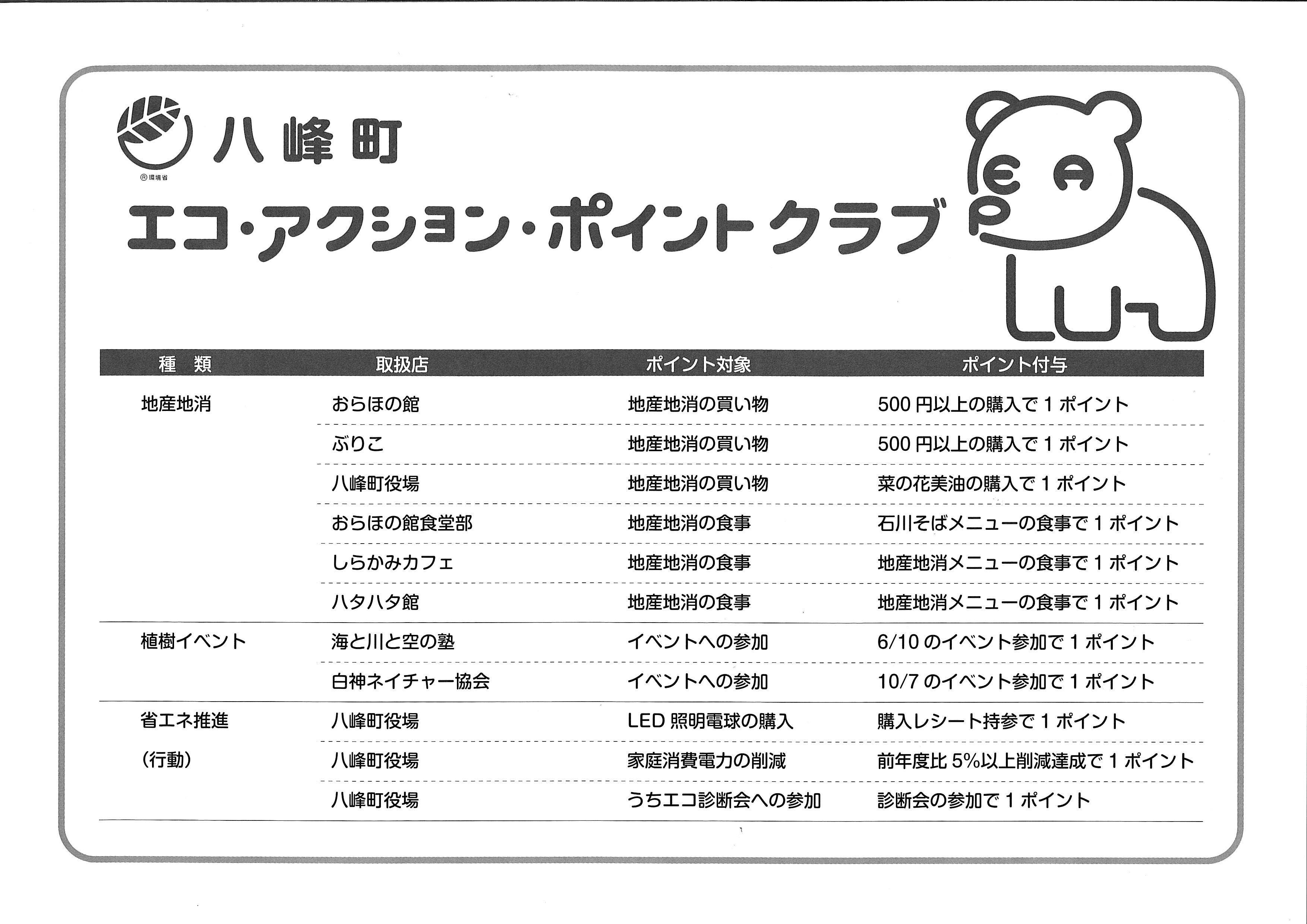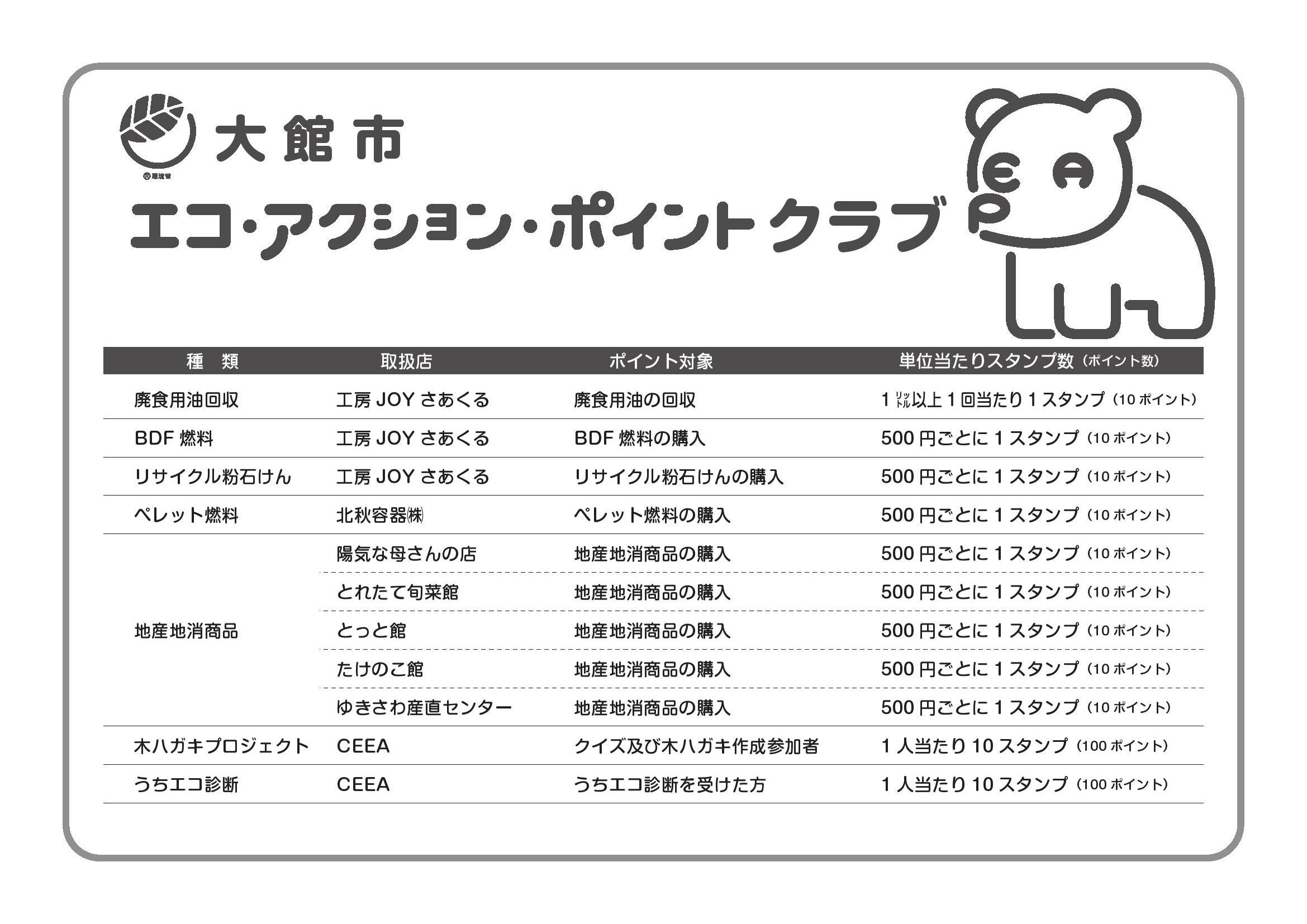 このポイントは,大館市,八峰町での地産地消商品取扱店舗での買い物,「うちエコ診断」の受診や環境イベント参加などの,住民の方々の環境配慮行動(エコアクション)に付与されます.