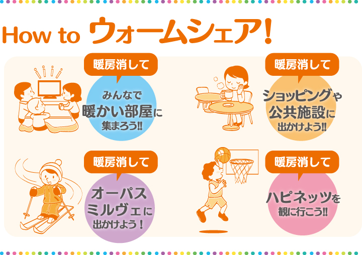 秋田市クール&ウォームシェア普及促進コンソーシアムでは、「暖房を切って出かけよう!」をキャッチフレーズに、新聞広告、コンソーシアム団体の機関誌や館内放送、秋田市広報などを通じて、ウォームシェアへの参加を広く呼びかけました。