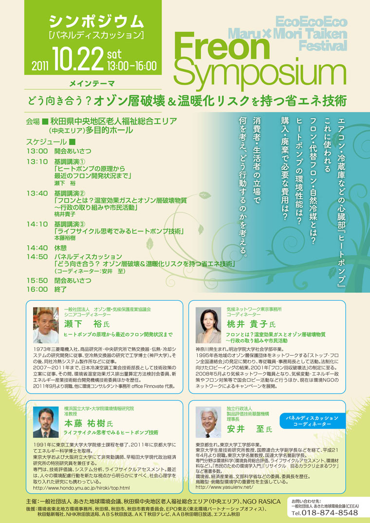 あきた地球環境会議(CEEA)では、平成23年度よりフロンに関する知識普及、意識変容を目的とした活動を展開しています(公益信託地球環境保全フロン対策基金助成)。
