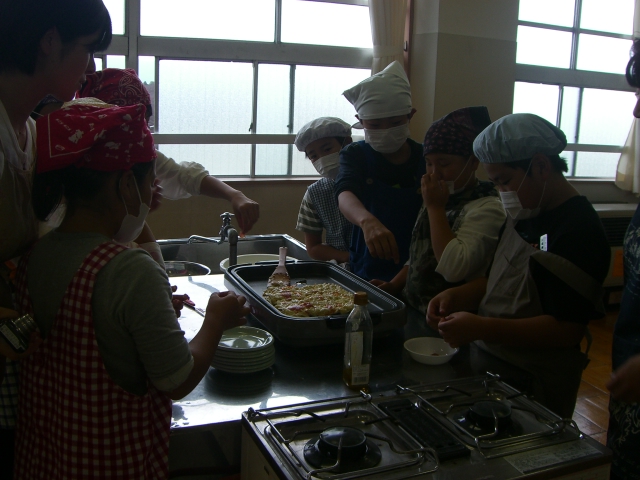 前回の大曲南中に続いて参加型を交えた楽しい講義の後、今回は「エコのみ焼き(省エネクッキングで作るお好み焼き)」に挑戦しました。