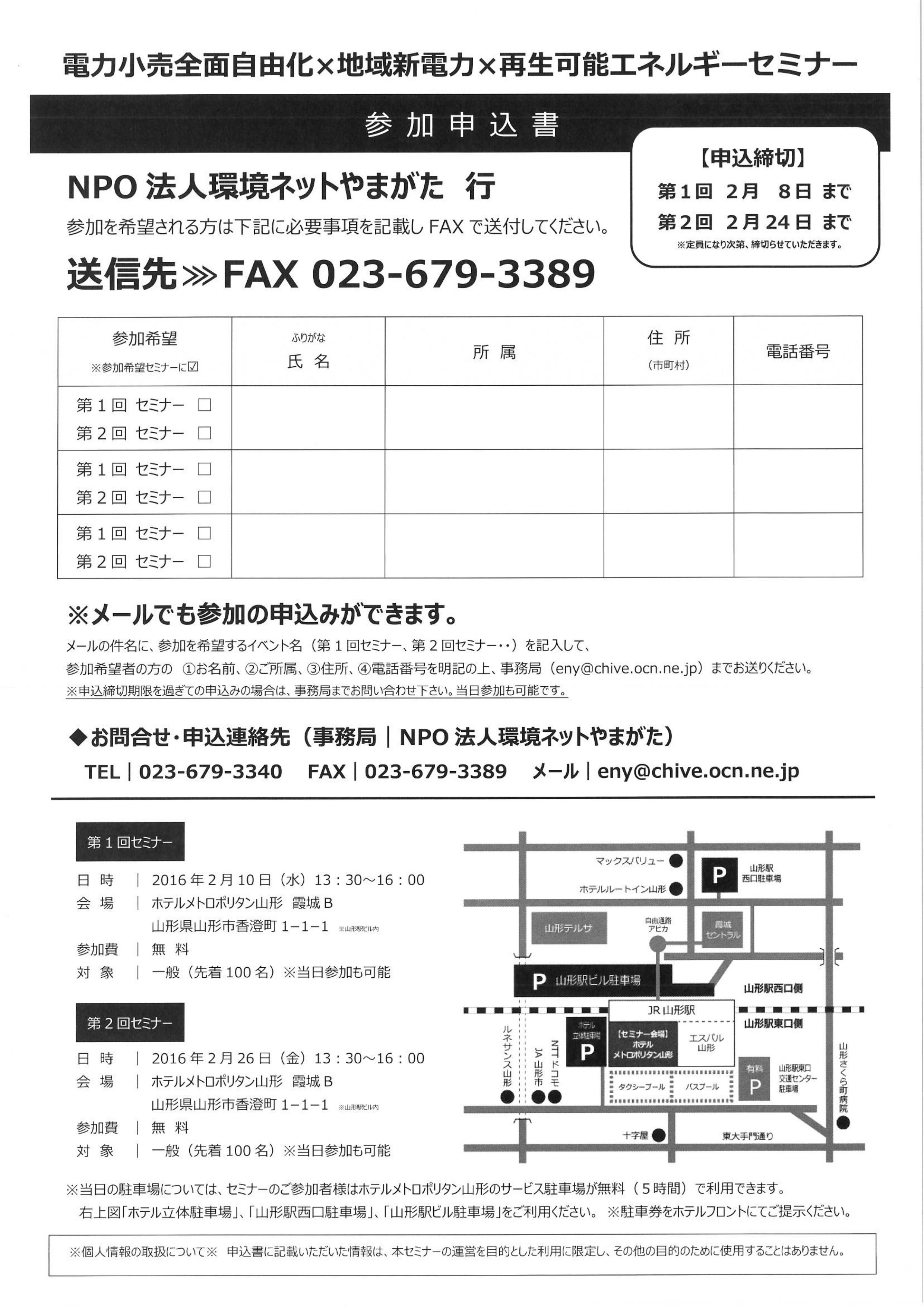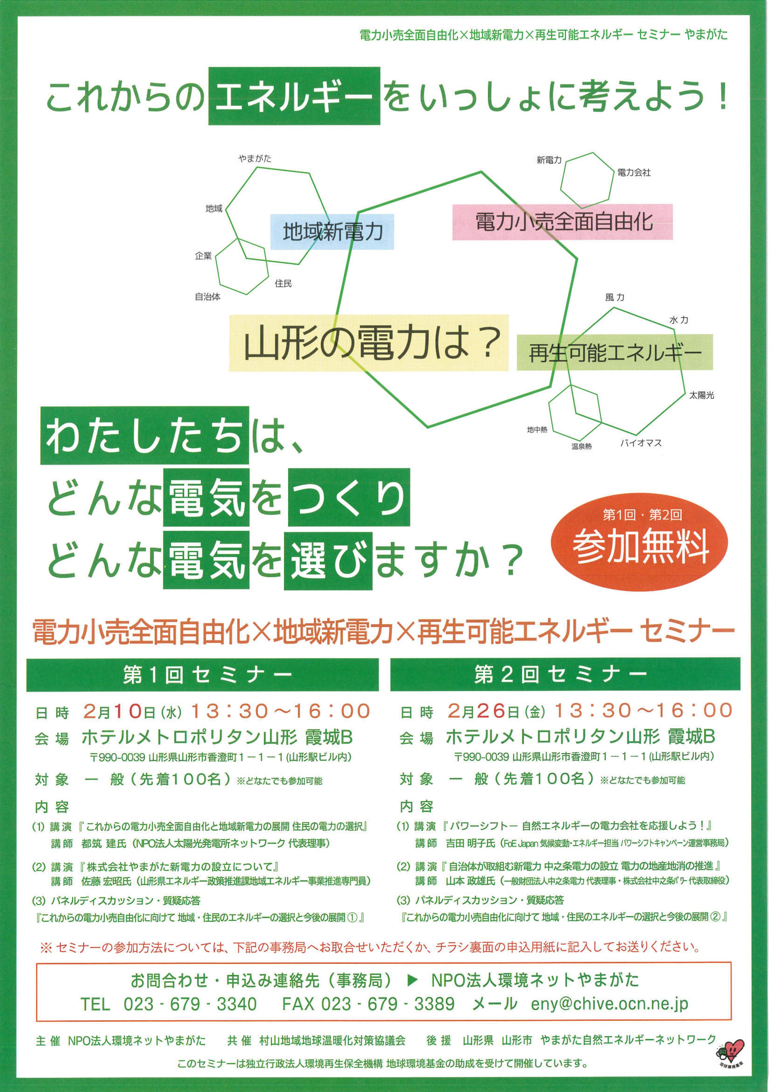 国がすすめる電力システム改革の一環で、平成28年4月から開始される電力小売全面自由化や、地域での新電力設立、再生可能エネルギーの普及に向けて、一般市民・企業・行政など対象にしたセミナーが山形市で開催されます。私たちがどのような電力を選択し、利用していくかを考えてみませんか?